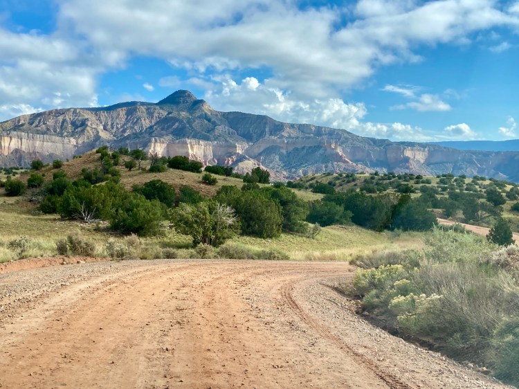 There were no balloons in the air today as I traveled north as it was a “yellow flag” day. The sky was overcast, and thundershowers were a possibility. The balloon riders and balloon followers must be disappointed. There was a substantial but brief shower as I drove between Albuquerque and Santa Fe, but there were also periods of warm sun. Highway 84 took me miles past Abiquiu to the forest service road that leads into the canyon. Occasional signs along the dirt road warned “flash flood area,” but the road was still intact. I didn’t dare stop in the occasional muddy spots for fear I wouldn’t get traction in my wimpy little car to take me through them and up the next incline. But I made it safely and arrived as the sun poured its warm rays throughout the canyon.
