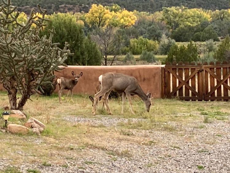 A doe and two fawns in the courtyard of the guest house cautiously turned to look at me as I came through the gate. It didn’t seem to bother them that I and another guest stopped to stare at them. When I went to the common room to fix myself a cup of tea, I happened upon Don and Kathy and Frank. Gathered in the little kitchen area, we struck up a long and interesting conversation about our religious upbringings, the Bible, and our current communities of faith. One of the blessings for me in coming here is meeting interesting people from other parts of the country and sharing faith stories.